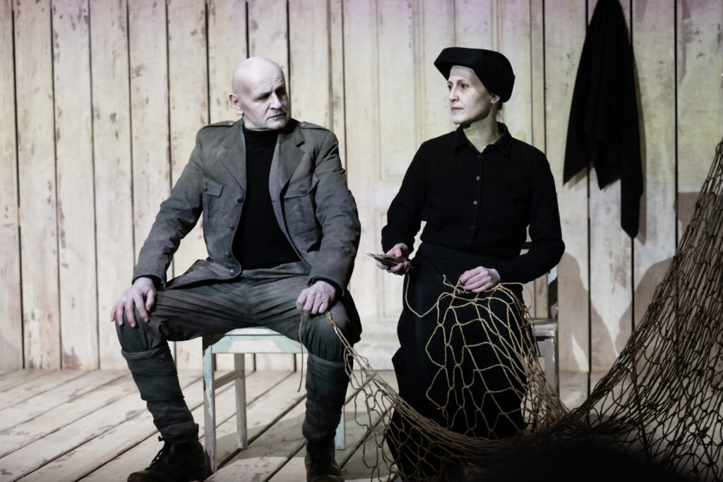 Ewald Palmetshofer: Die Fragen, die Brechts Text stellt, wirken irritierend gegenwärtig. Es ging aber nicht darum, die Gegenwart im Historischen zu suchen, sondern das Historische sichtbar zu machen, großzuziehen und als Verfremdung zu nutzen. Die Aktualität der Argumente in Brechts Stücktext wird dadurch umso deutlicher. Es war aber klar, dass mit dieser Spielweise im zweiten Teil, in „Würgendes Blei“, gebrochen werden muss. So stellt eine der Stimmen in Deigners Text die Frage, was für ein Krieg das hier ist und in welcher Zeit wir sind. Man weiß im zweiten Teil nicht genau, ob die Zeit im Zeitraffer bis ins Heute fortgeschritten ist oder ob es eine zeitlose Zeit ist, in der die Figuren aus dem historischen Setting als Wiedergänger auftreten. So muss der zweite Teil eine andere Ästhetik haben und versuchen, sich der Carrar als zeitgenössische Figur zu nähern. Deigners Text regt das auch an, weil die Sprache darin auf besondere Weise lyrisiert und formalisiert ist. Die Schauspieler*innen sind bei Deigner eher eine Spieler*innengruppe. Sie befragen die Figur der Carrar, nachdem sie den Brecht-Teil gespielt haben.